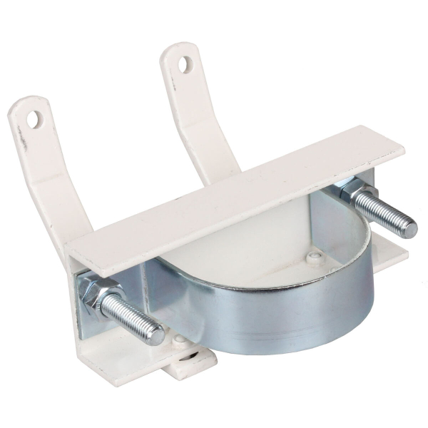 Dvojitý držák na síťovačky a košťata konstruovaný pro montáž na sloupek plotu s průměrem od 40 mm do 65 mm.
