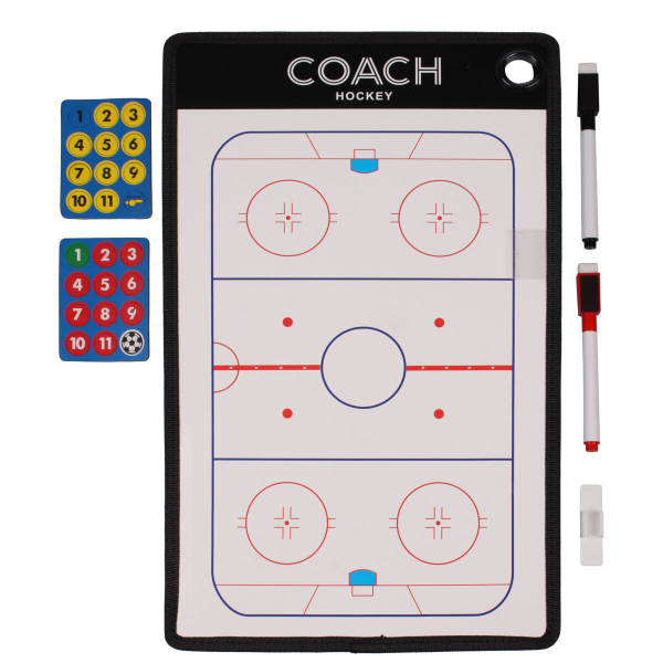 Merco Hockey 38 patří mezi základní vybavení každého trenéra hokeje a slouží pro demonstrování a plánování herních strategií. Pro rozmístění hráčů v poli využijete dvě sady odlišně barevných magnetů s čísly a pro další tahy a znázornění pohybů hráčů popisovač s houbičkou. Magnetická tabule nabízí z jedné strany náhled na celé hřiště a z druhé strany na polovinu hřiště. Taktická deska Merco Hockey 38 je nejsnazší a nejrychlejší cesta pro vaše přesné herní pokyny hráčům kdykoliv během zápasu! - rozměry tabule: 38 x 23 cm - hmotnost balení: cca 0,4 kg